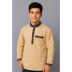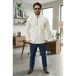 this unique men's kurta shirt, perfect for both casual outings and special occasions. Crafted from soft, breathable cotton, this full-sleeve shirt offers all-day comfort. The standout feature is the intricate woven trim on the collar, cuffs, and button placket, adding a touch of traditional artistry to a modern silhouette. Its clean lines and tailored fit make it a versatile piece you can dress up with slacks or down with jeans. Premium Cotton Fabric: Lightweight and comfortab..